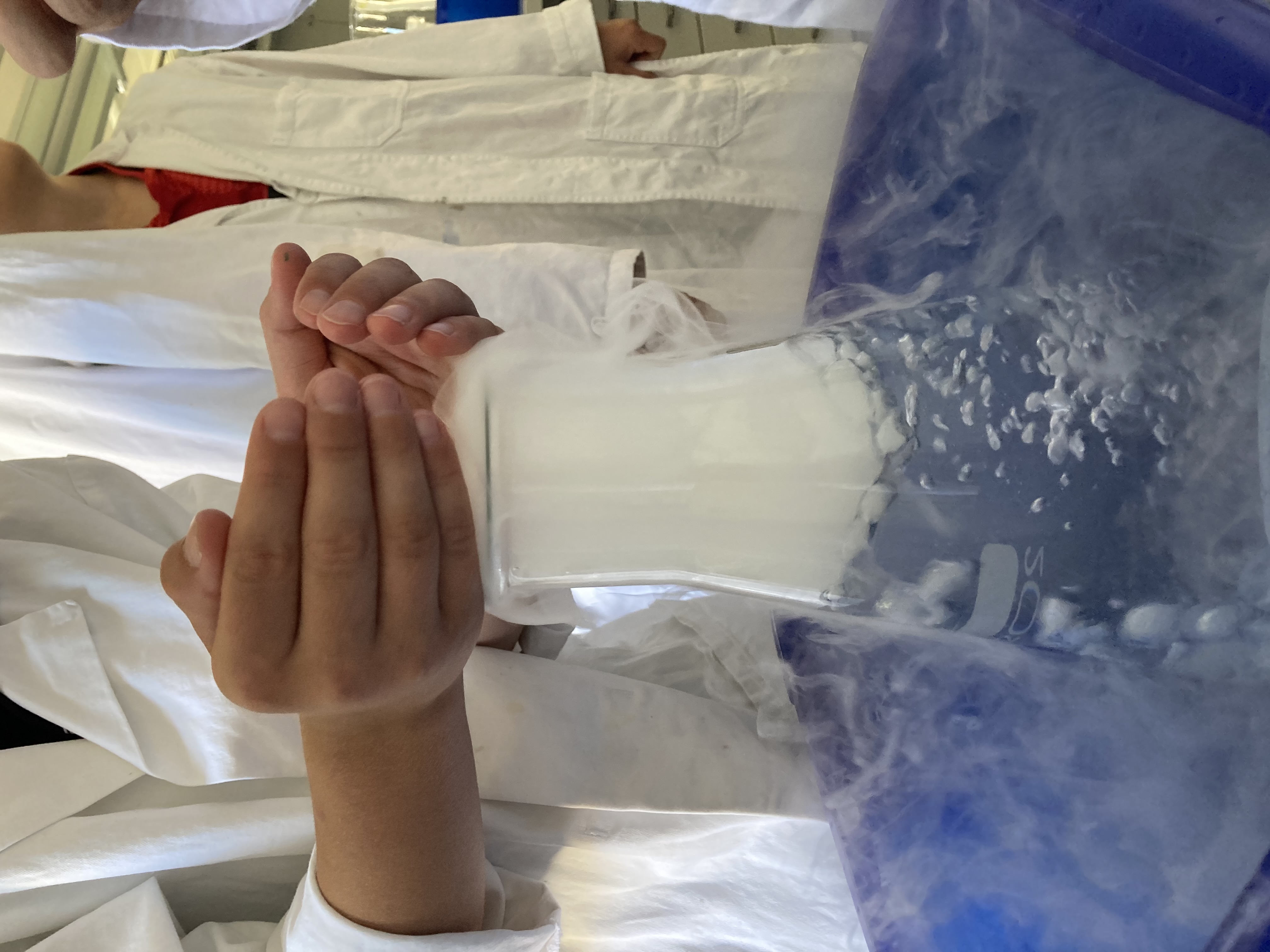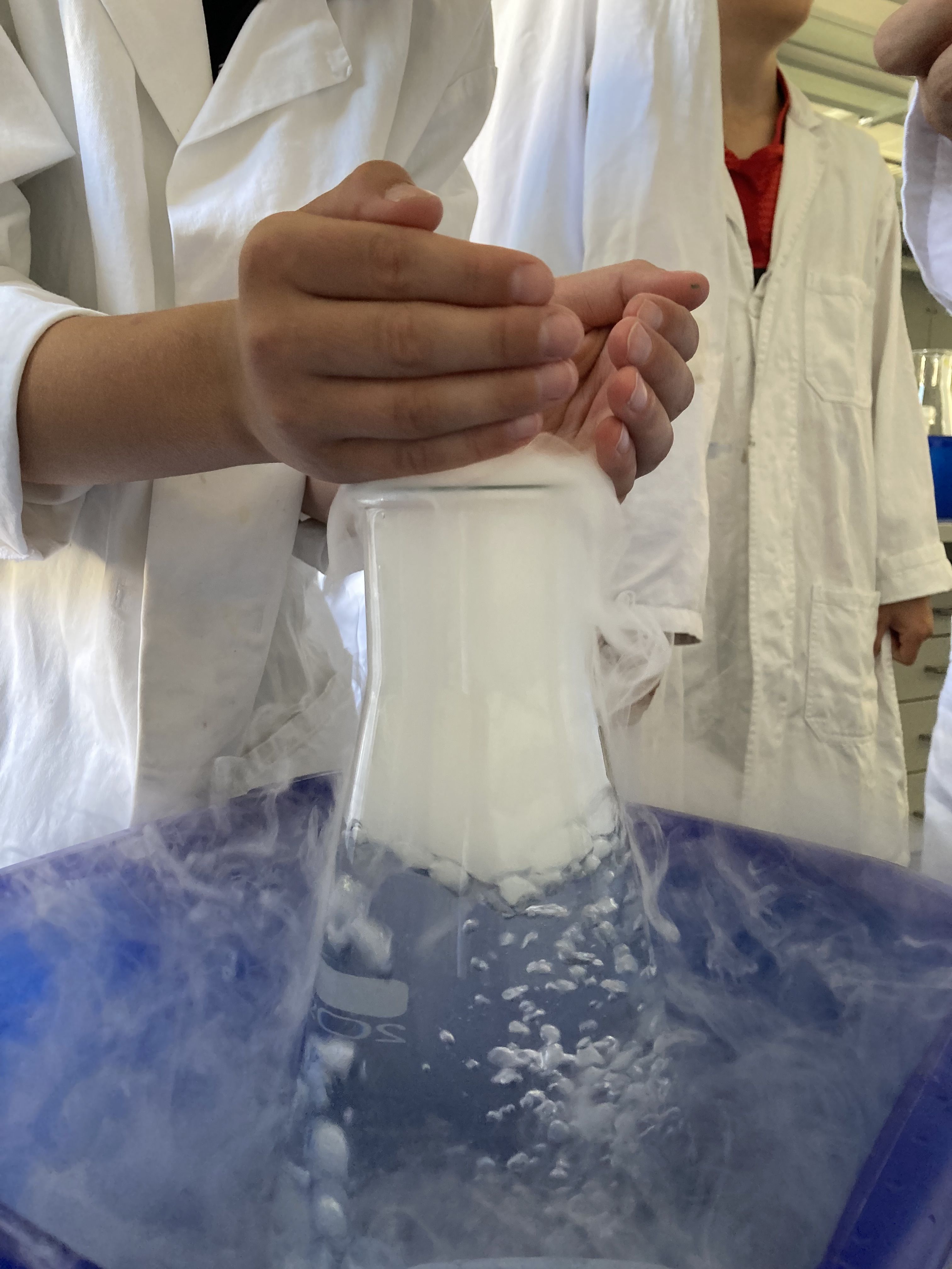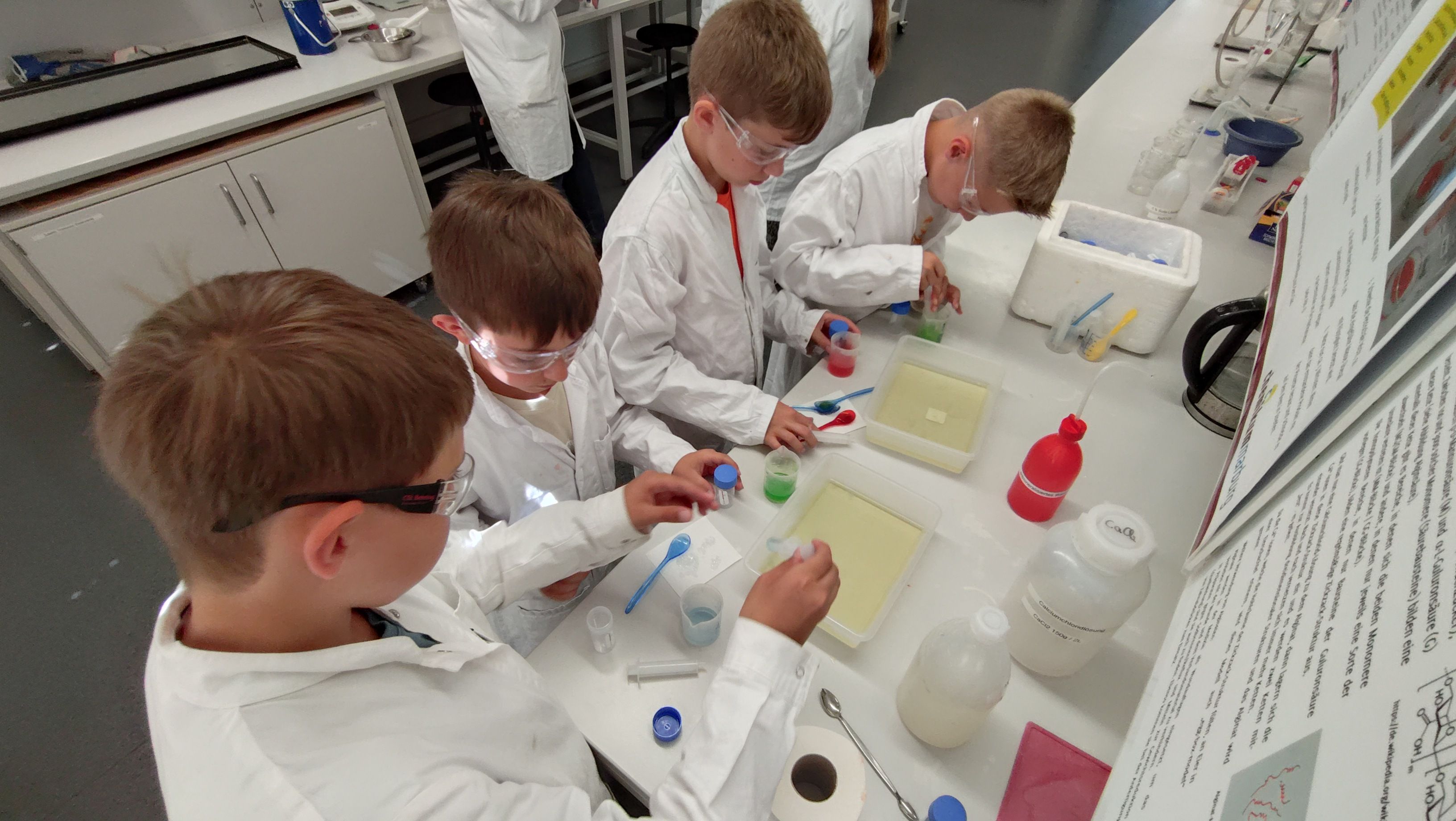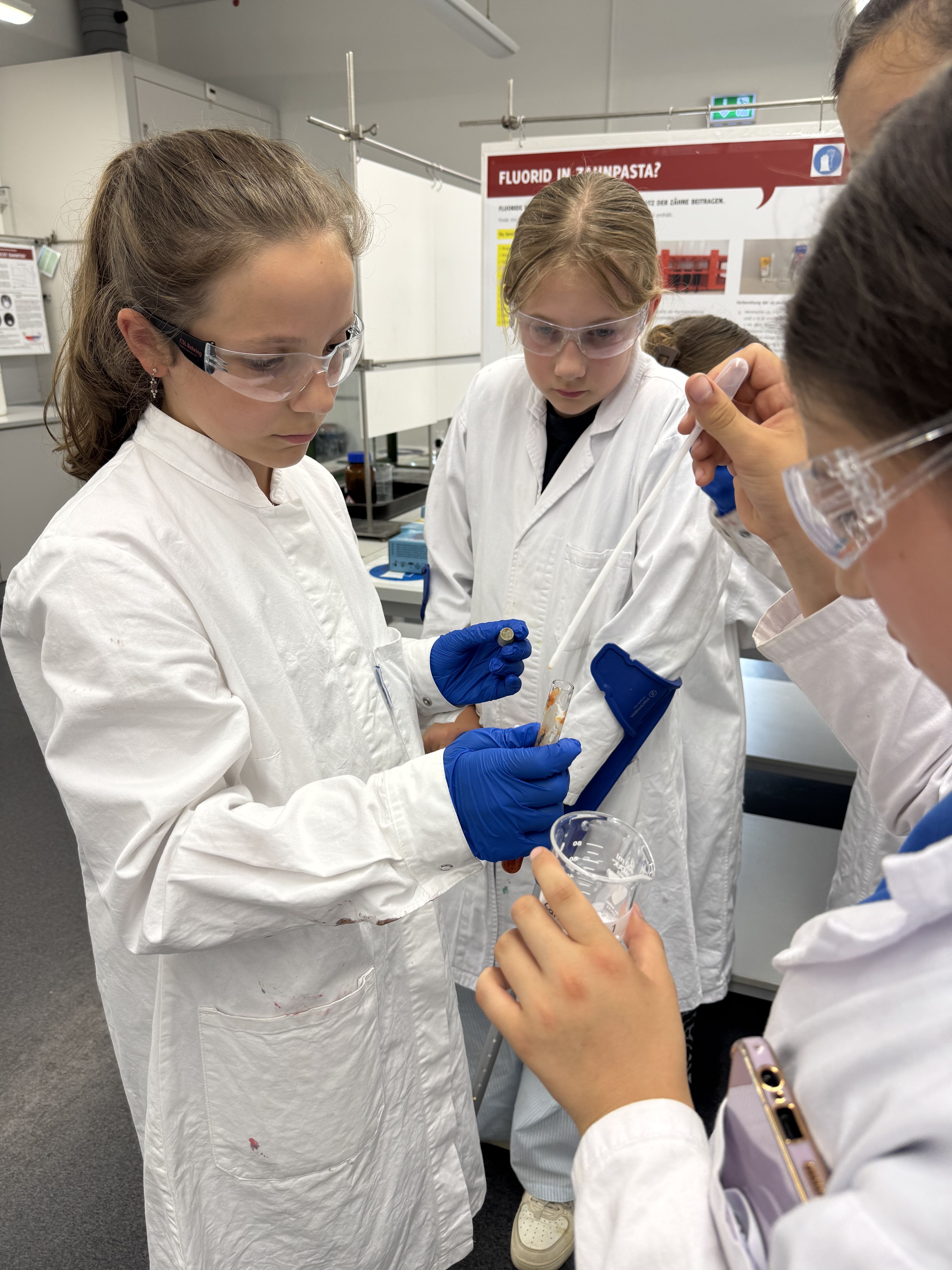 Am 02.07.2025 machten sich die drei Kurse der Jahrgangsstufe 5, geleitet von Anna Hehl, Timo Jung und Wolfgang Stowasser, auf den Weg ins Chemikum. Ausgestattet mit Laborkittel und Schutzbrille konnten die jungen Forscherinnen und Forscher vor Ort in kleinen Gruppen eigenständig experimentieren. Dabei nutzten sie ihr Vorwissen aus dem Profilunterricht, um viele spannende Fragen durch praktische Versuche zu beantworten.