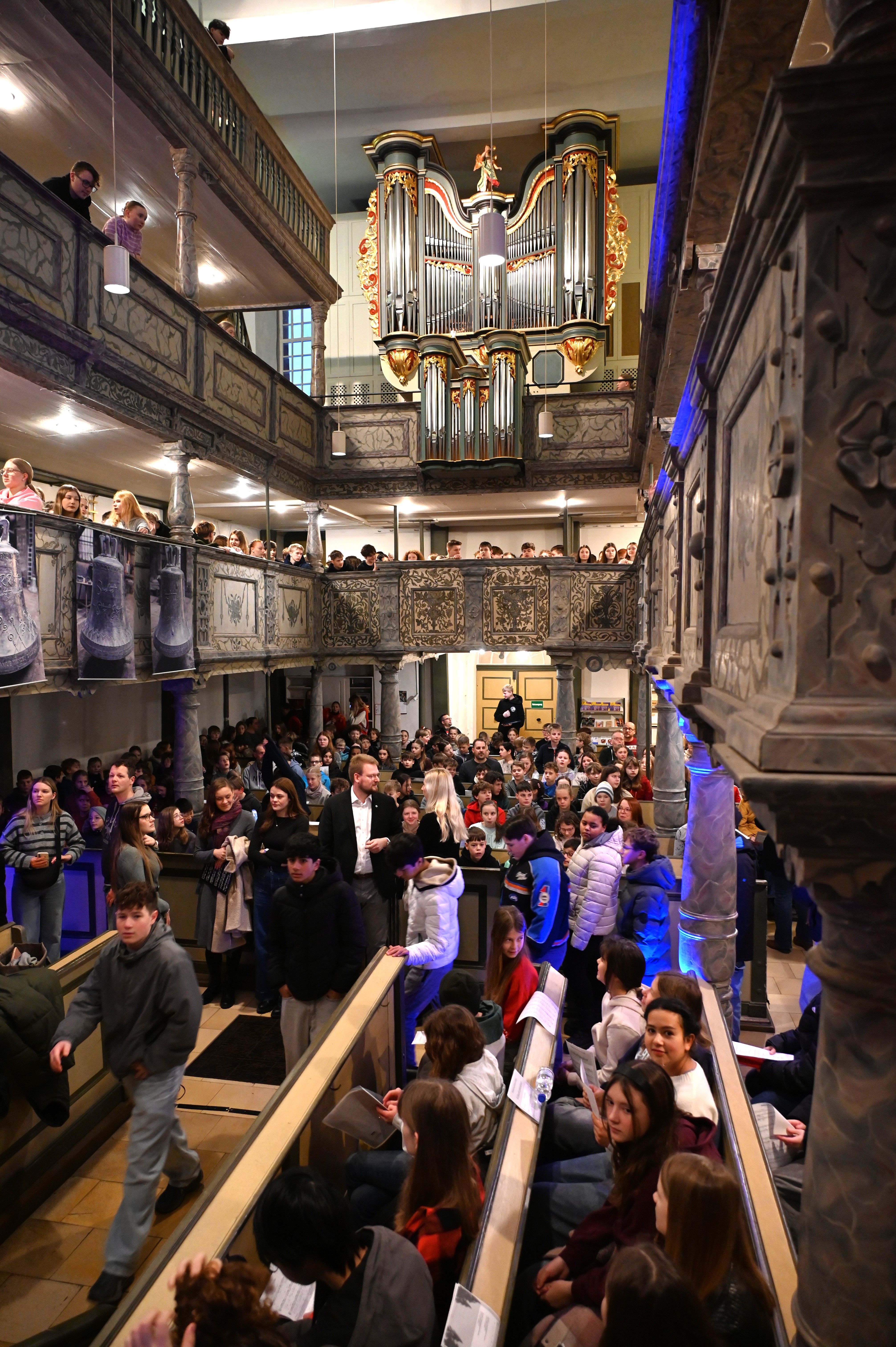 Küster Matthias Schneider freute sich sichtlich, dass das Haus endlich nochmal proppenvoll war. So ein Schulgottesdienst ist zwar selten so ruhig und gesittet, wie man es von regulären Gottesdienstfeiern kennt. Aber das ist nicht weiter schlimm, denn im Zentrum der Veranstaltung stehen ja nicht Disziplin und Regeln, sondern dass die frohe Botschaft von Weihnachten zur Geltung kommt.