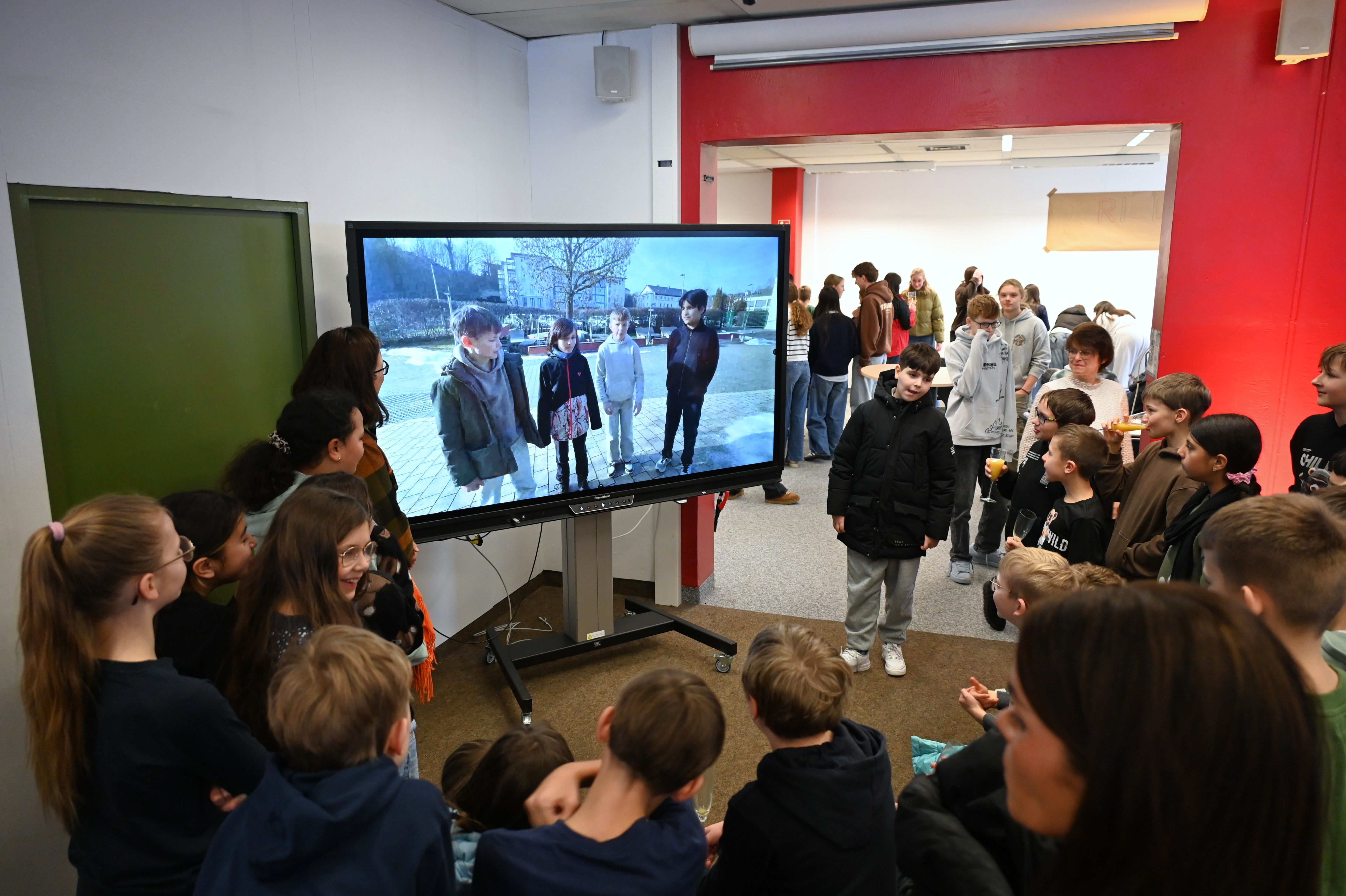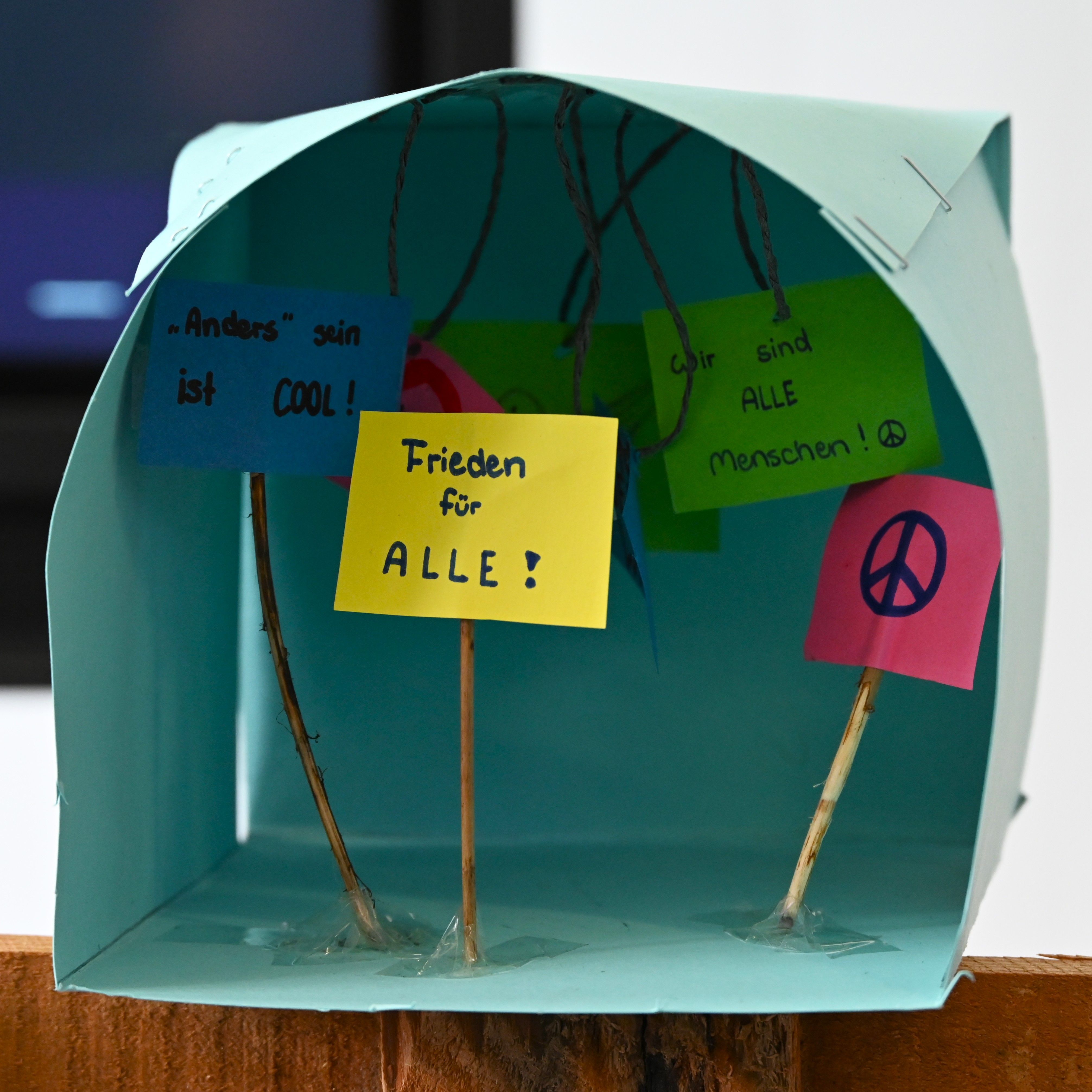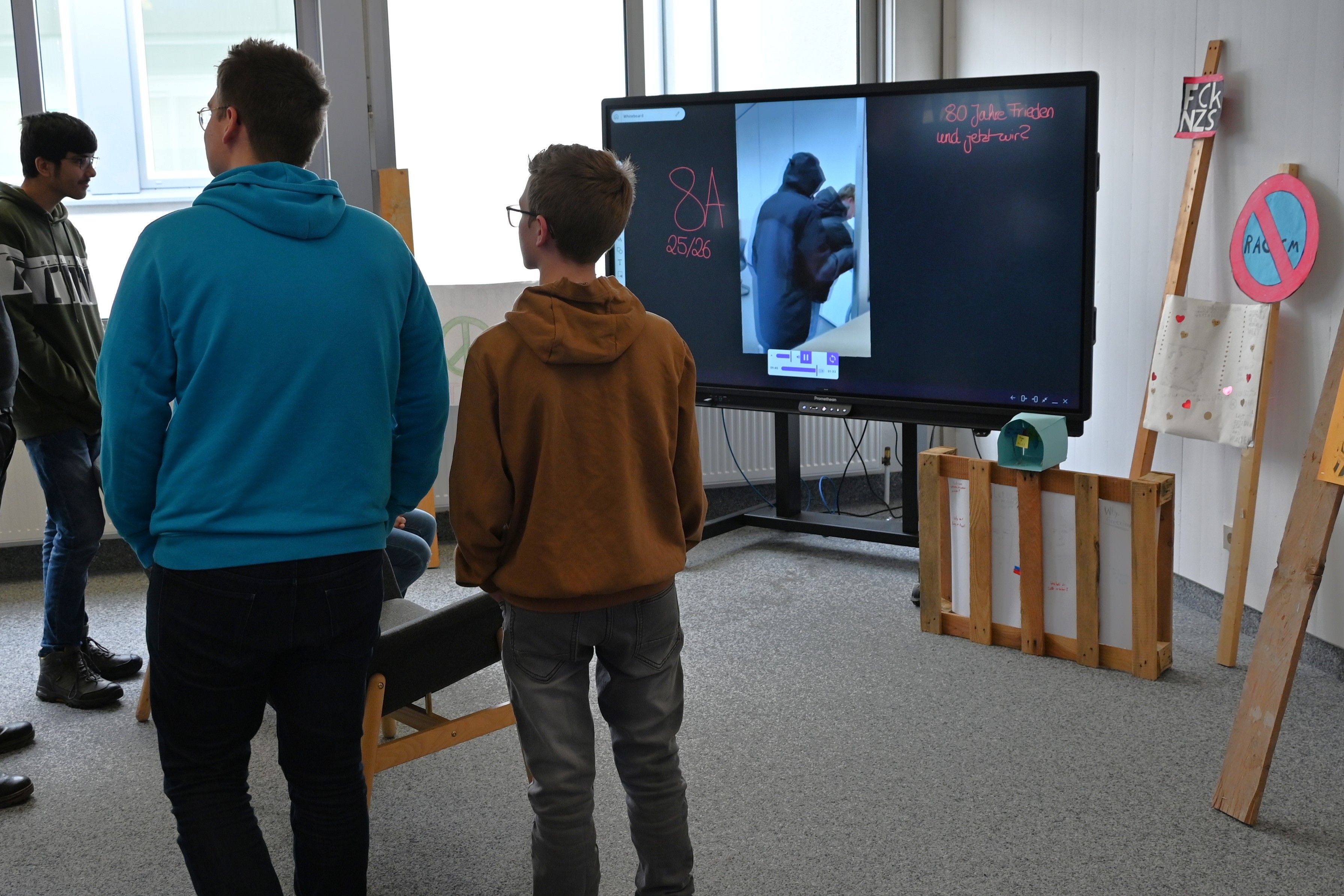 Die aus verschiedenen Klassen oder von Einzelpersonen eingegangenen Wettbewerbsbeiträge wurden nun in einer Ausstellung zusammengetragen und in einer festlichen Vernissage am 2. Februar der Öffentlichkeit präsentiert. Die AG-Mitglieder Kati Weigel und Jonas Seibel begrüßten in ihrer Eröffnungsrede die zahlreichen Gäste: alle Wettbewerbsteilnehmerinnen und -teilnehmer, viele interessierte Schülerinnen und Schüler sowie Lehrerinnen und Lehrer, aber auch Vertreterinnen und Vertreter des Schulelternbeirates. Schulleiter Martin Hinterlang zeigte sich in seinem Grußwort beeindruckt von der Vielfalt an Produkten, die zusammengetragen wurden: Texte in Form von Erlebnisberichten oder Gedichten, Videoclips mit Spielszenen oder Zeitzeugeninterviews, selbstgeschriebene Lieder oder künstlerische Installationen, die das Thema bildlich ergründen, und vieles mehr. Musikalisch umrahmt wurde die Vernissage von Jonatan Schmidt am Piano, der mit John Lennons „Imagine“ dazu anregte, sich eine friedlichere Welt als die jetzige vorzustellen.