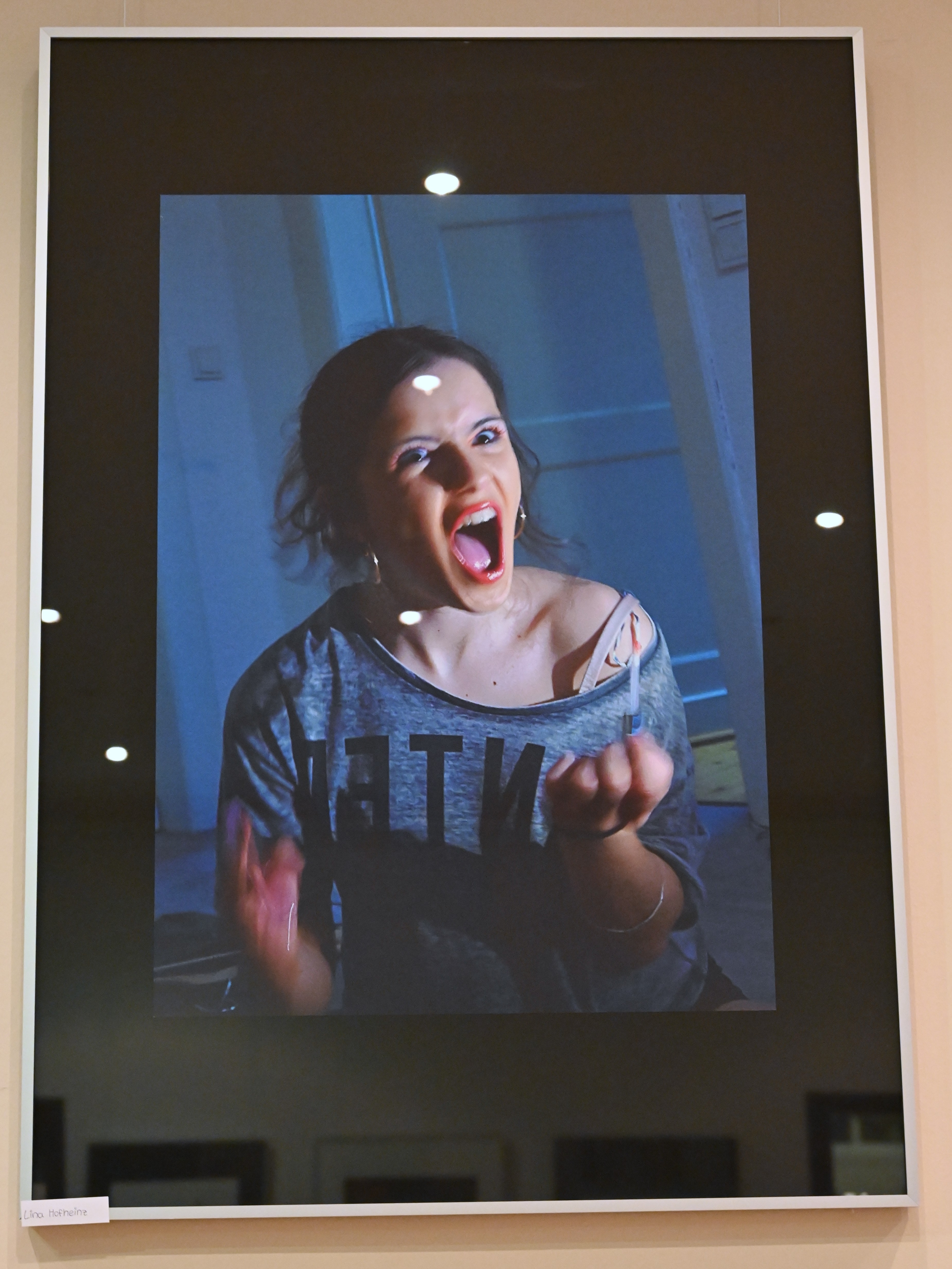 Ein weiterer Schwerpunkt lag auf fotografischen Arbeiten. Schwarz-weiß-Fotos, auf einer Exkursion in Frankfurt entstanden und im schuleigenen Labor entwickelt, sowie inszenierte Selbstporträts, Momentaufnahmen und experimentelle Bildideen setzten sich mit gesellschaftlichen Rollenbildern, Emotionen und Inszenierungen nach Cindy Sherman auseinander. Besonders eindrucksvoll waren die großformatigen Fotografien, die gesellschaftskritische Themen wie Identität und Selbstwahrnehmung aufgriffen. Gerade diese Werke regten zum Nachdenken und Diskutieren an – ganz im Sinne einer Ausstellung, die nicht nur gefallen, sondern auch bewegen will, wie es Sascha Schulze in seiner Eröffnungsrede deutlich machte. Neben der Wertschätzung für die künstlerischen Arbeiten war ihm wichtig, dass die in der Schule entstehende Kunst auch im öffentlichen Raum einen Platz bekommt.