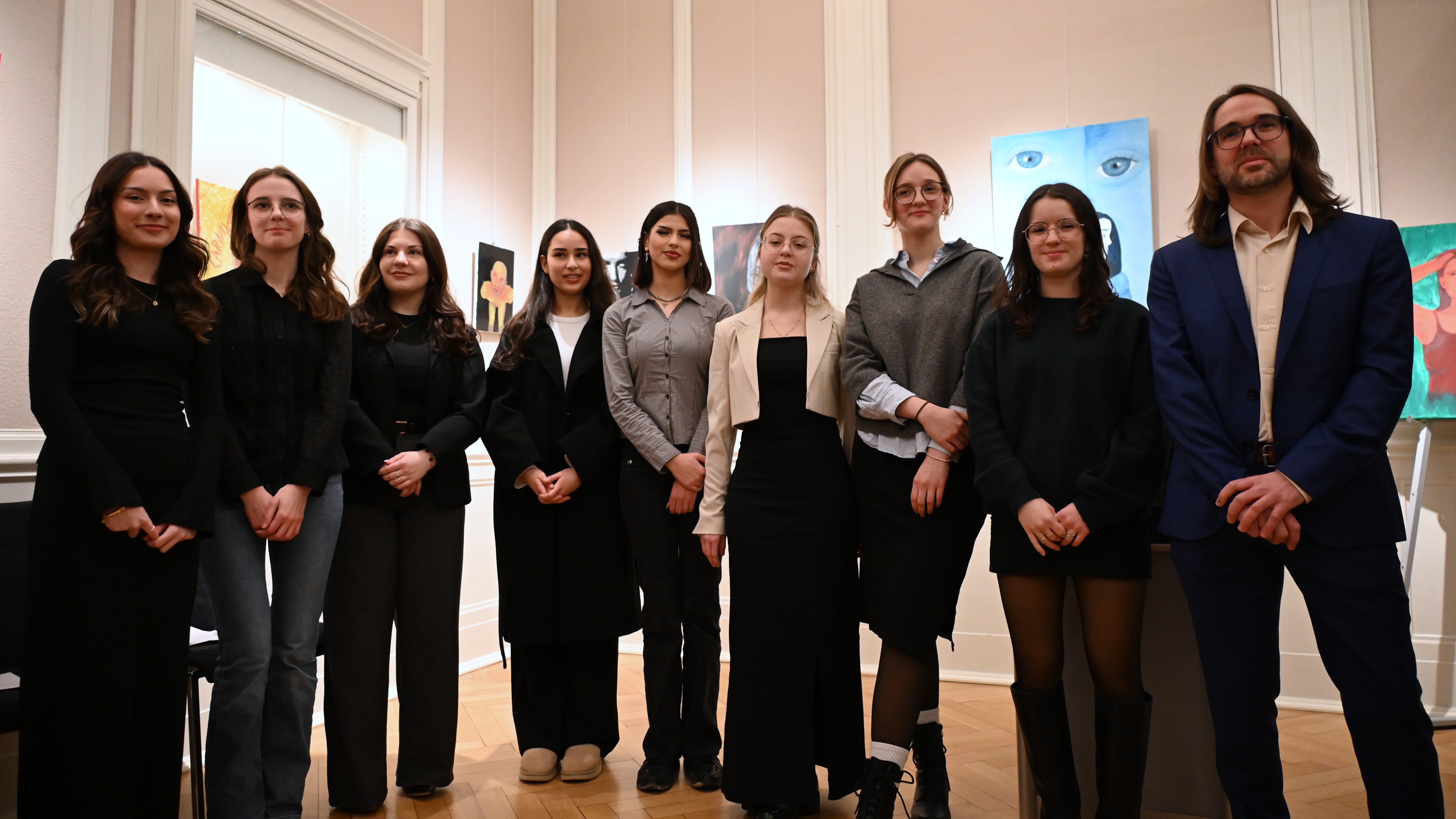 Gruppenfoto, v.l.: Ebru-Nur Baykal, Maja Pieck, Hailey Textor, Nisa Sarikus, Mina Demirdöven, Janset Sagirkaya, Amy Graf, Lina Hofheinz, Kunstpädagoge Sascha Schulze (es fehlt: Yagmur Kizil)