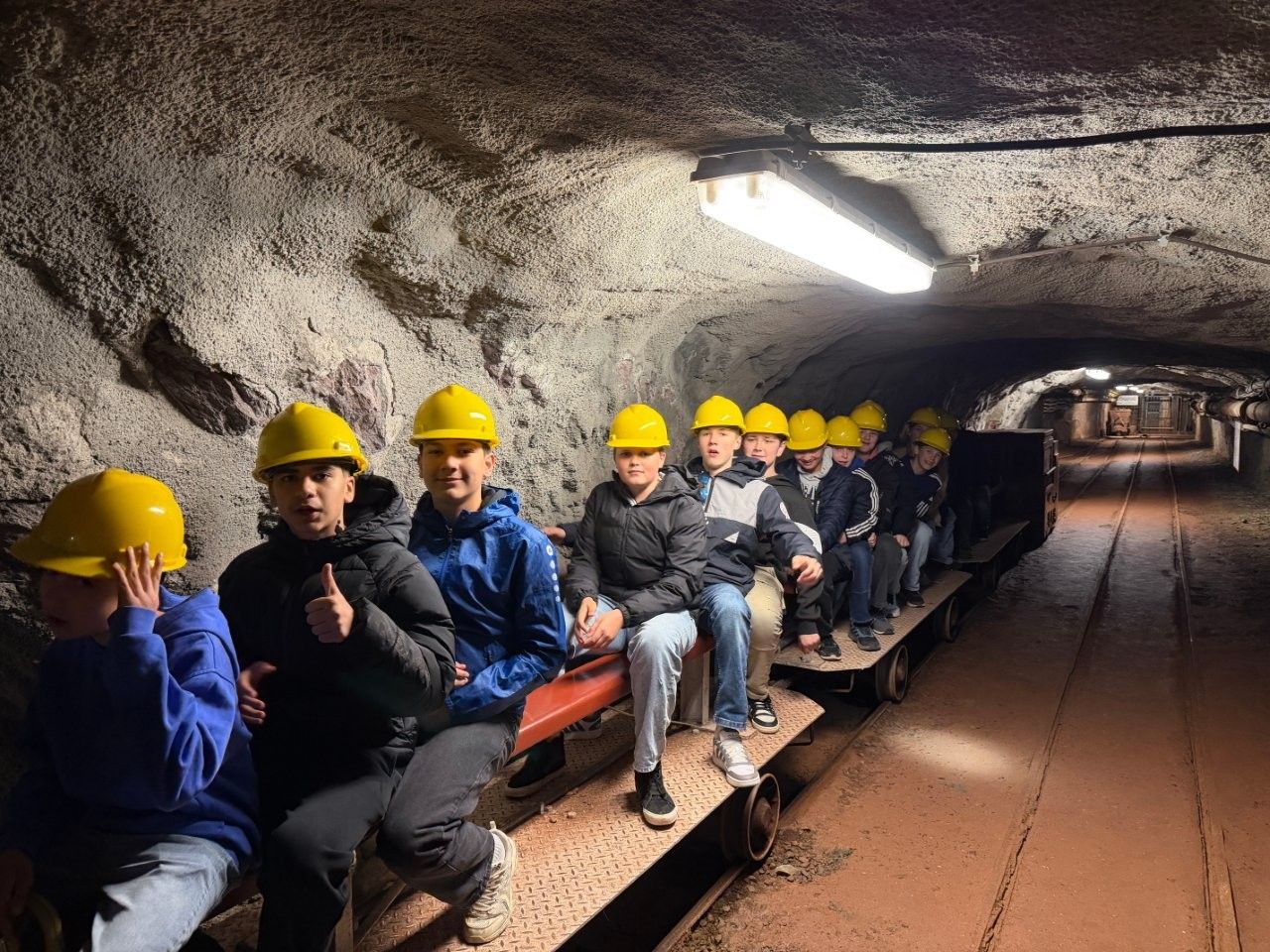Der Zugang erfolgte durch einen Stollen, der in den zentralen Schacht mündet. Mit dem bergmännischen Gruß „Glück auf“, der sowohl die Hoffnung auf reiche Funde als auch auf eine sichere Rückkehr ausdrückt, fuhren die Schülerinnen und Schüler in den Berg ein. Von dort aus ging es mit dem Förderkorb 150 Meter in die Tiefe. Anschließend brachte eine Grubenbahn die Gruppen in den Abbaubereich, wo originale Maschinen vorgeführt und ihre Funktionsweise erläutert wurden.