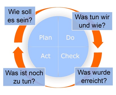 Der PDCA-Zyklus mit seinen vier Phasen „Plan – Do – Check – Act“, auch als Deming-Kreis bekannt, stellt ein etabliertes Modell der Qualitätsentwicklung und -sicherung von Organisationen und Produkten dar. Der jeweilige Prozess zur Entwicklung von Qualität wird geplant (P), durchgeführt (D) und anschließend untersucht (C). Beim Schlussfolgern (A) wird sich zu den Ergebnissen verhalten, was wiederum die nächste Planung beeinflusst. Weil sich die Phasen des Qualitätsprozesses immer wieder aneinanderreihen, ergibt sich ein Kreismodell der kontinuierlichen Qualitätsentwicklung (Hessischer Referenzrahmen Schulqualität [S.5]). Auf die Bedeutung des PDCA-Zyklus für schulisches Qualitätsmanagement wurde bereits im Qualitätskonzept der Schule (2017) hingewiesen.